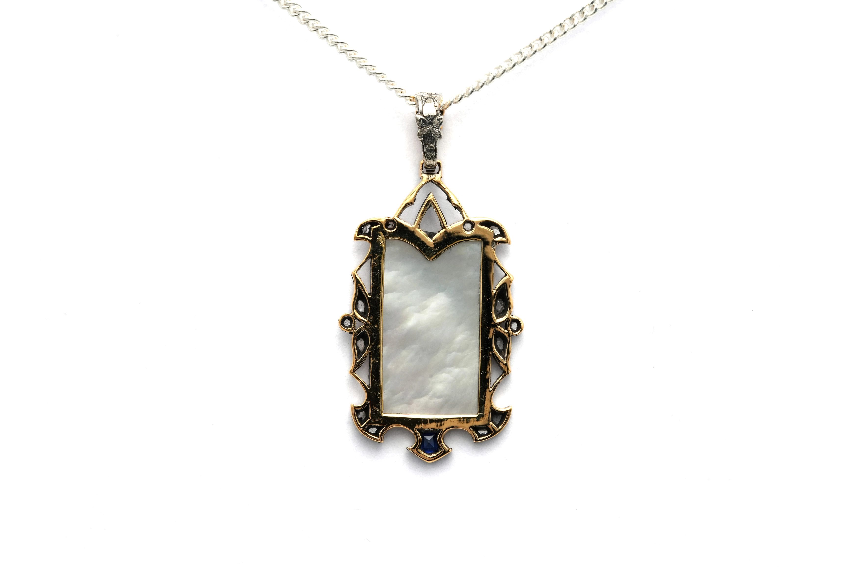 Il n'y a plus d'articles dans votre panierPendentif Art Déco en or jaune et blanc 18 carats serti de nacre, d'un saphir et de diamants "taille" rose