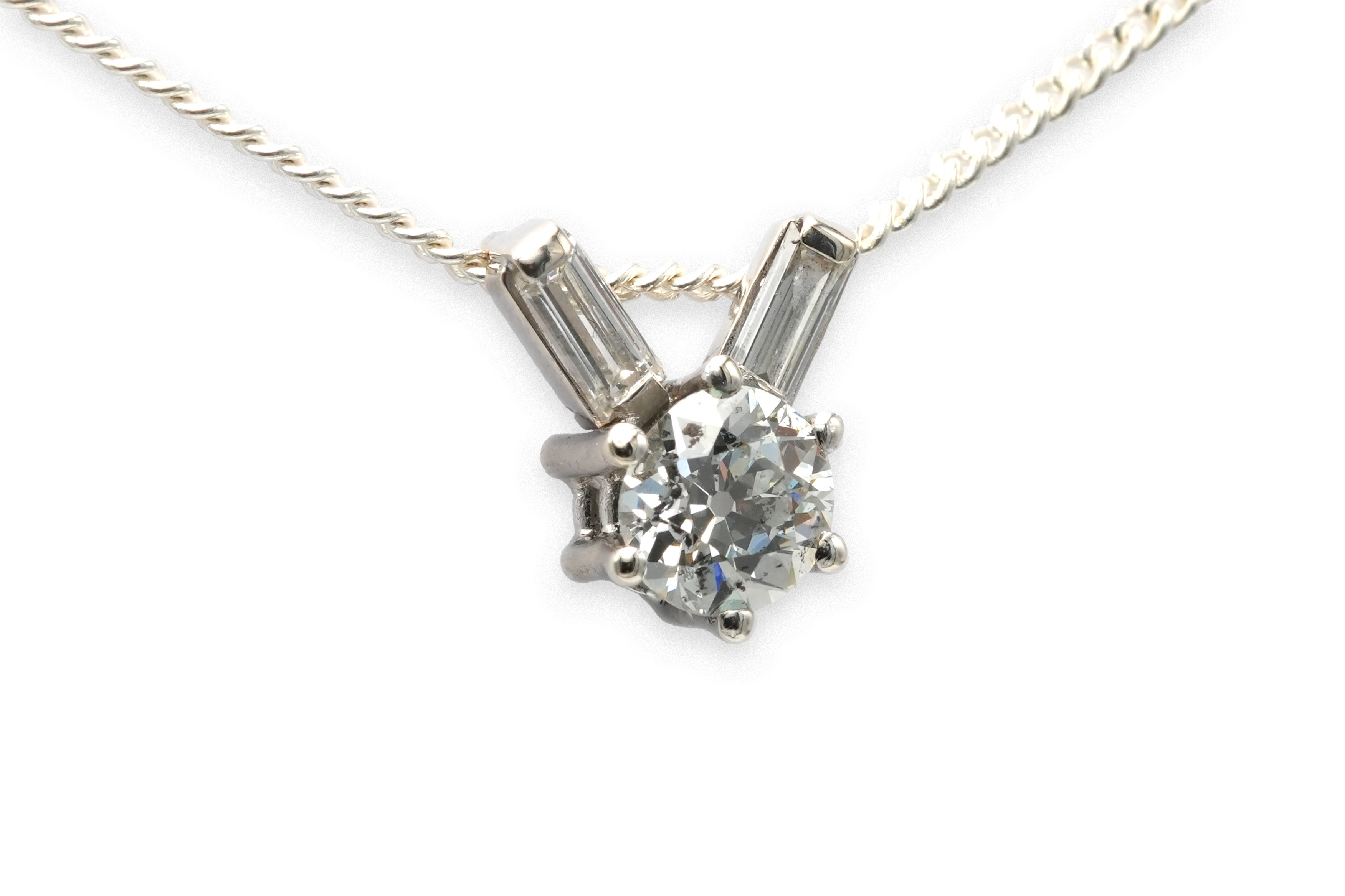 Il n'y a plus d'articles dans votre panierPendentif Années 70 en or blanc 18 carats serti de diamants "taille" baguette et d'un diamant old cut